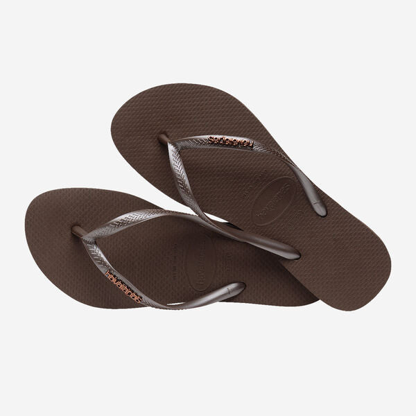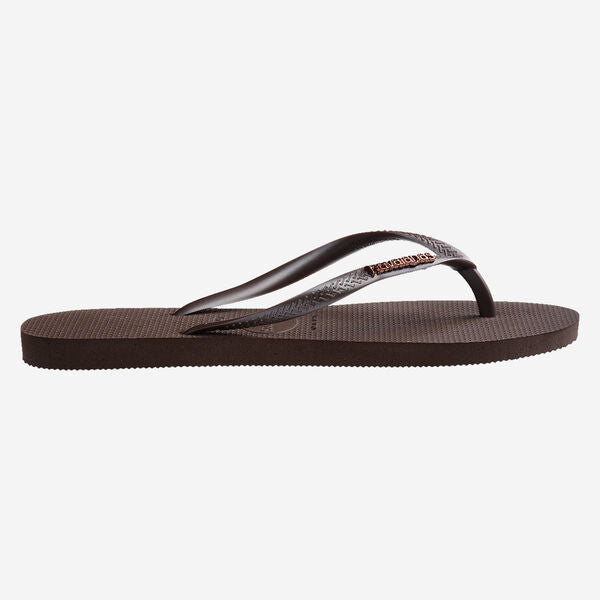 Las Havaianas Slim Logo Metallic mantienen su sofisticada forma slim, pero con unas tiras brillantes y un logo metálico que les confiere un toque elegante y festivo.
