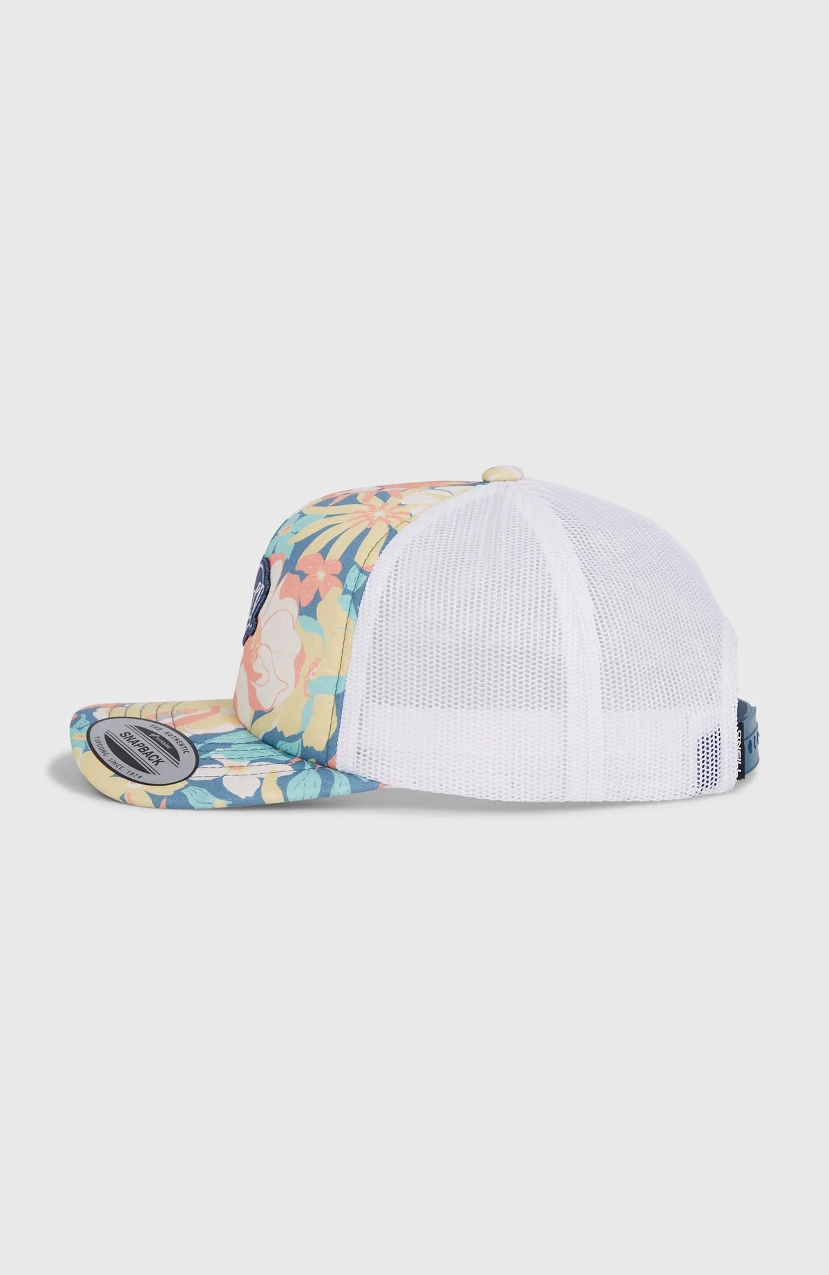 The Flood Trucker Cap features a colourful badge logo on the front. This six-panel trucker-style cap has a curved visor, inner tape, and breathable recycled polyester mesh rear panels. It includes a snapback closure for an adjustable fit and is made with 100% cotton.