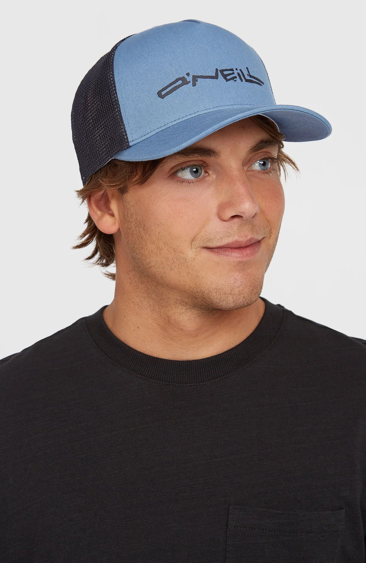 The Trucker Cap features branded artwork on the front. This five-panel trucker-style cap has a curved visor, inner tape, and breathable recycled polyester mesh rear panels. It includes a snapback closure for an adjustable fit and is made with 100% cotton.