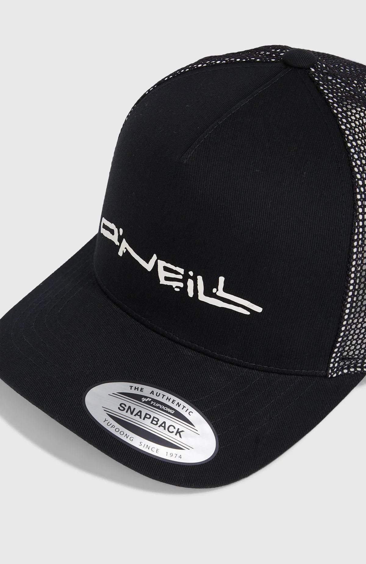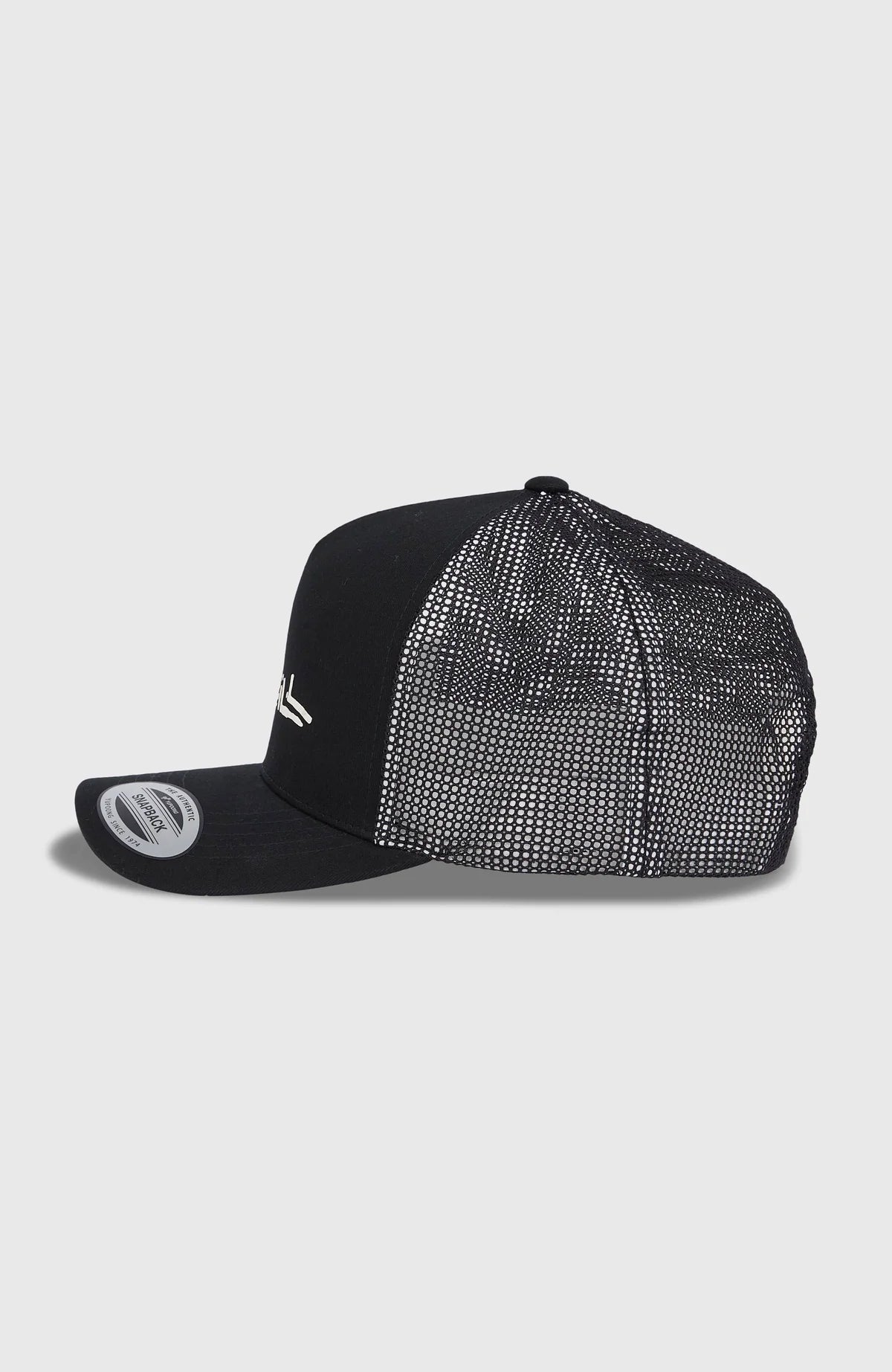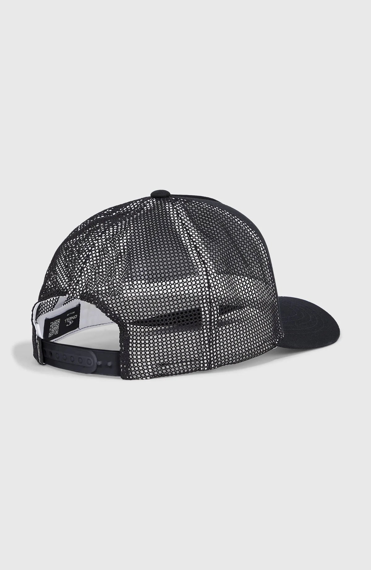 The Trucker Cap features branded artwork on the front. This five-panel trucker-style cap has a curved visor, inner tape, and breathable recycled polyester mesh rear panels. It includes a snapback closure for an adjustable fit and is made with 100% cotton.