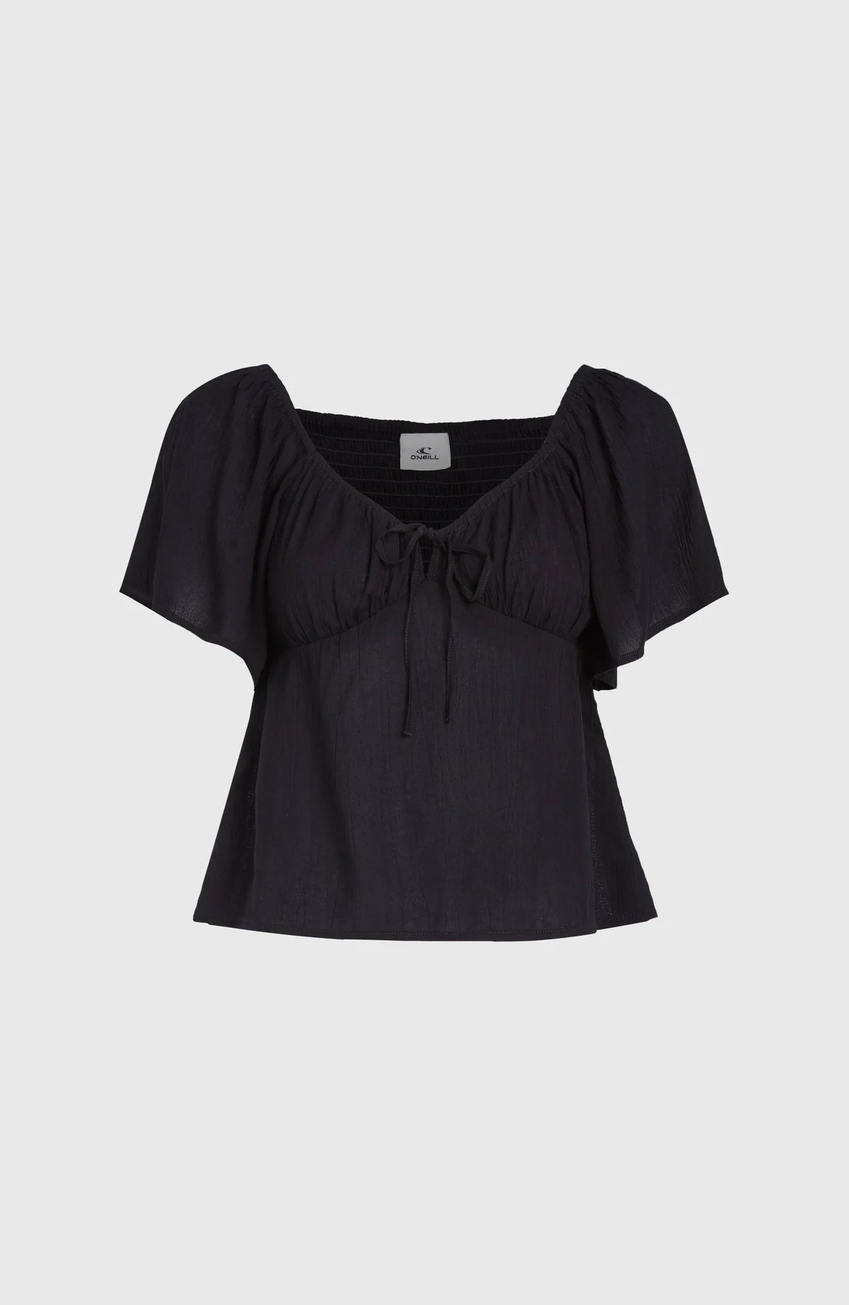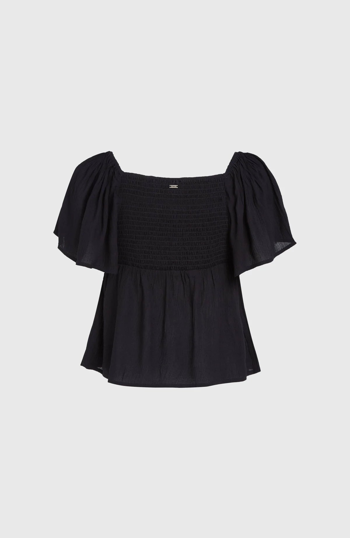 A ready-for-the-sun neckline meets breezy flutter sleeves in the Huges Woven Top. The regular-fitting top features an adjustable fabric tie at the centre of the V-neck design, with encased elastic at the shoulder and around the neckline. Its encased elastic back with shirring completes the beachy design. Made with 100% Livaeco viscose.