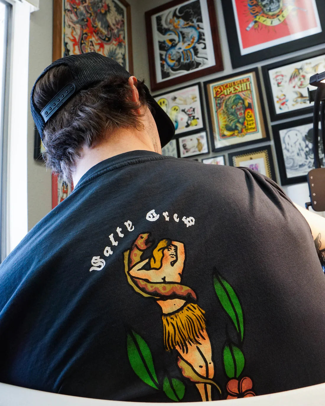 ARTIST COLLAB // Ryan "Hopper Doggy" Hopper is a surfer, fisherman, family man, and tattoo artist from Southern California. His traditional and nautical inspired tattoo flash is featured on the skin of a bunch of crew members and now featured on our tees, hats, and hoodies, for both men's and women's.
